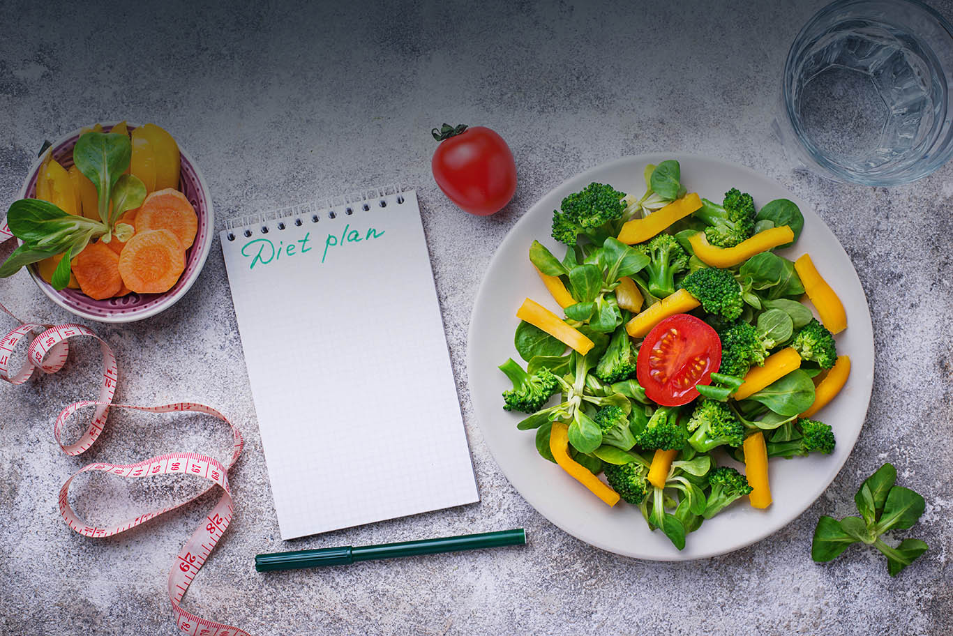 Healthy vegetable salad, water and measuring tape